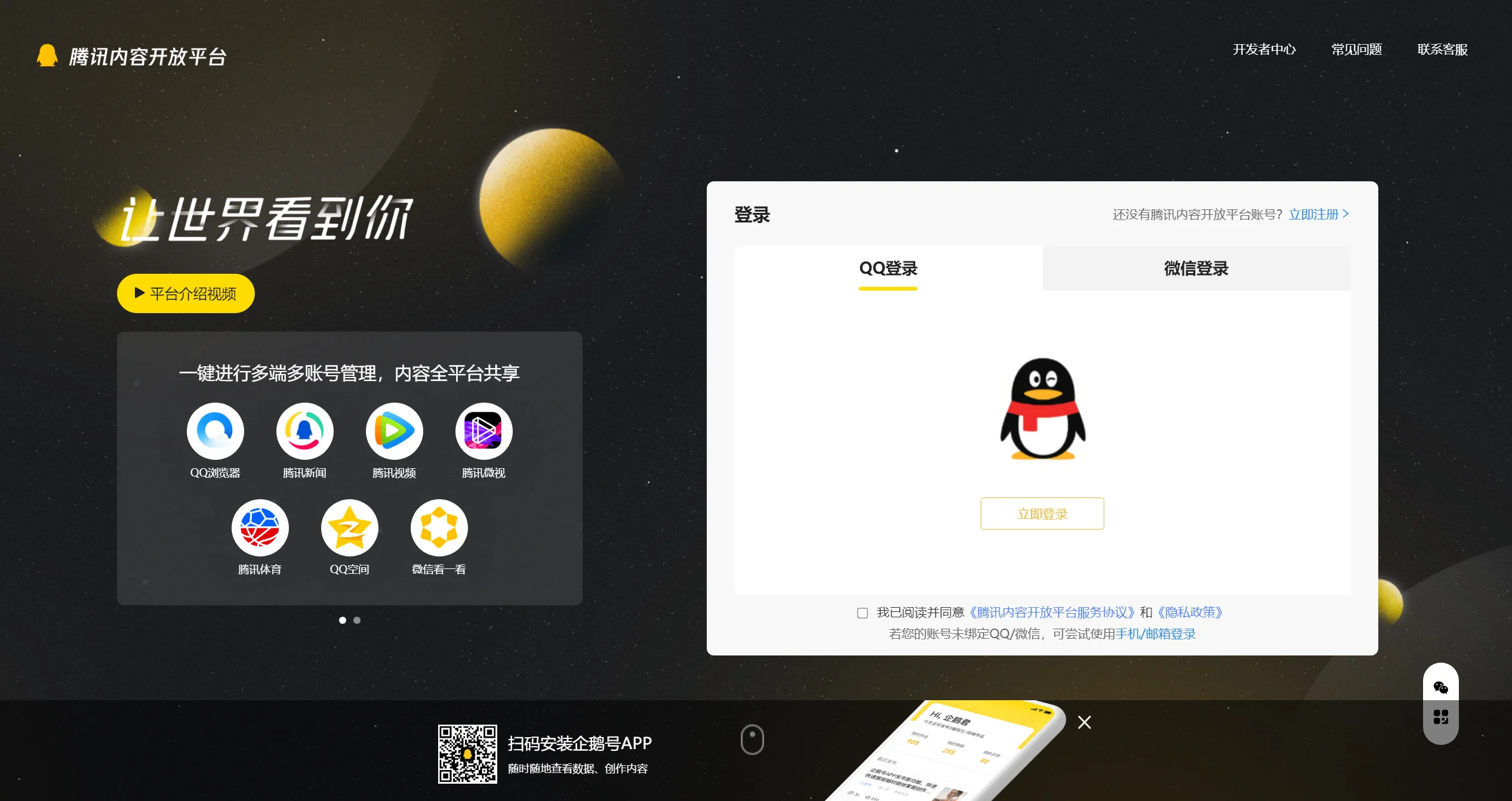 企鹅号是腾讯公司于2016年推出的内容创作运营平台,定位为腾讯"大内容"生态核心入口。它整合了微信、QQ、腾讯新闻等十大分发渠道,覆盖日均超100亿流量,支持创作者实现"一点接入,全平台分发"。平台致力于帮助媒体、自媒体、企业、机构获得更多曝光与关注,持续扩大品牌影响力和商业变现能力。
